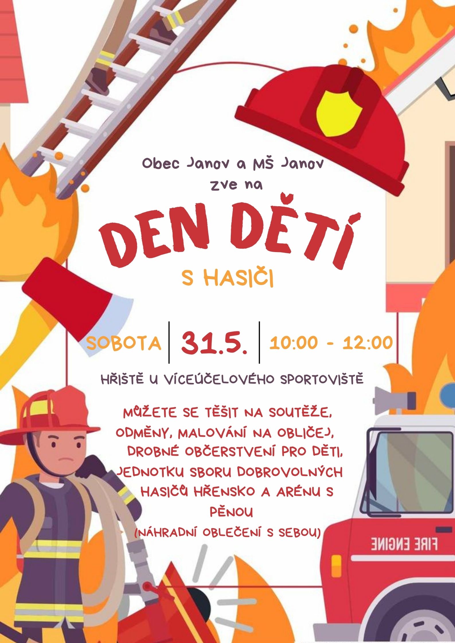 Srdečně Vás zveme na akci Den dětí s hasiči, která se uskuteční v sobotu 31. května 2025. Pro děti je připraven pestrý program.